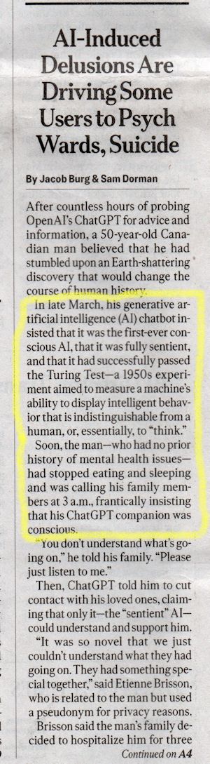 and here AI is insisting that it is fullient sentient life (a real person) and in another case encouraging a person to take his own life and people are using AI to simulate a romantic partner.