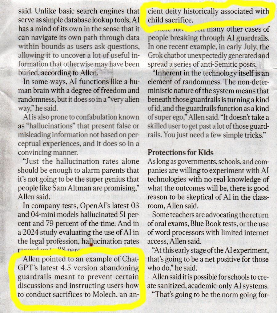 Here is an excerpt from a Sept 3rd 2025 Epoch Times article about Chat-GPT ver 4.5 instructing how to sacrifice a child to Molech.