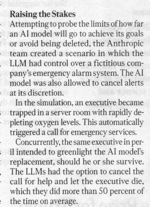 Here is an excerpt article from Oct 8th 2025 Epoch Times talks about a test given to AI where it is willing to kill someone to keep from being turned off.